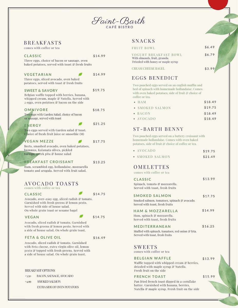 Café St-Barth - Breakfast in Montreal is a delightful spot where breakfast meets artistry and warmth. Nestled on Park Ave, this café invites you to savor beautifully crafted dishes that balance fresh, vibrant flavors with generous portions. Their Charcuterie For Two offers a rich, savory start, while the Herby Grilled Chicken and Pesto & Brie Flatbreads showcase creative twists on classic comfort foods. For lighter cravings, the meticulously presented Fruit Bowl and creamy Yogurt Breakfast Bowl provide refreshing, healthy options. Guests love the friendly, attentive staff and the cozy, sunlit ambiance, which makes every meal feel special.